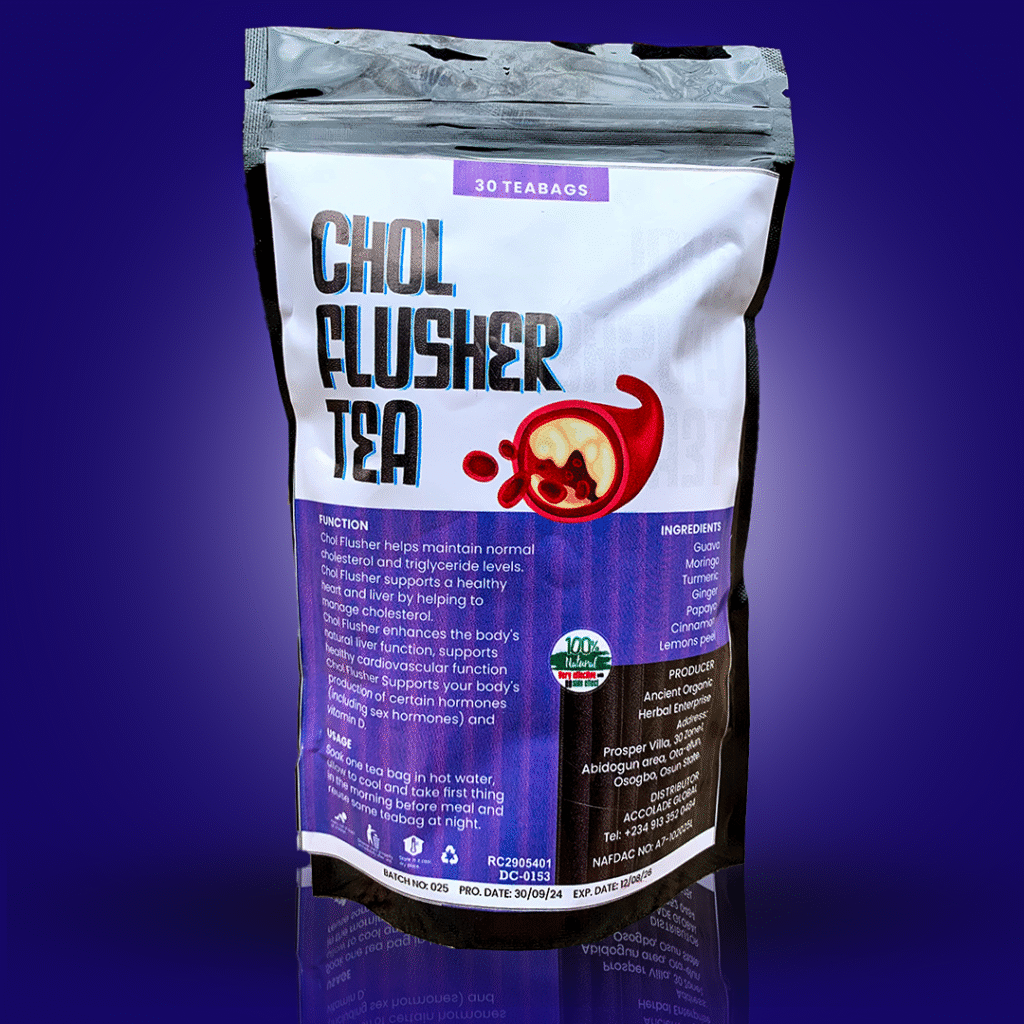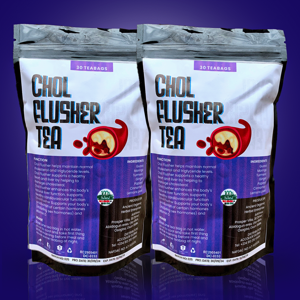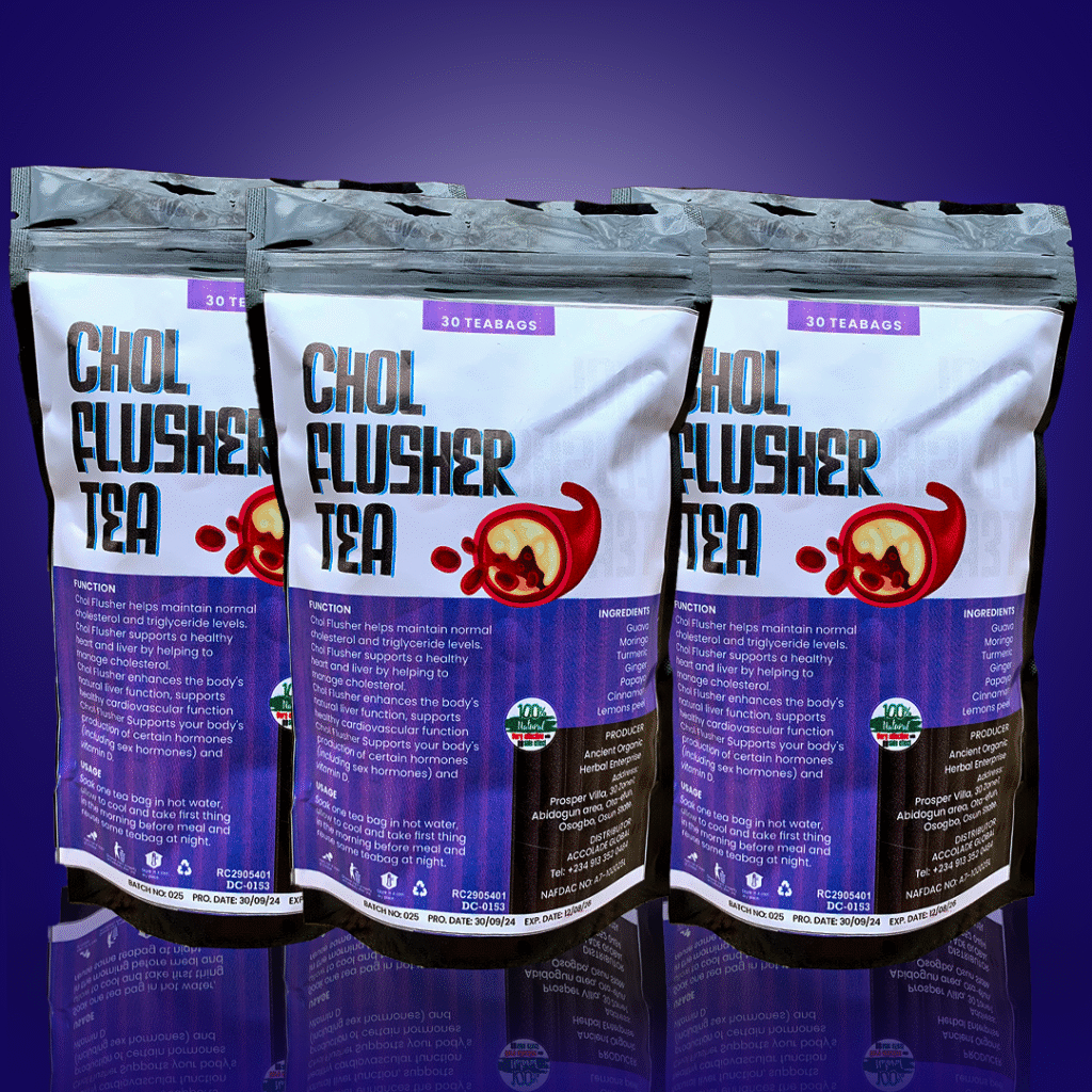 CHOLESTEROL FLUSHER TEA: This teabags help normalize cholesterol levels and support cardiovascular health. They cleanse the body of toxins, reducing symptoms associated with high cholesterol, such as fatigue and poor circulation.